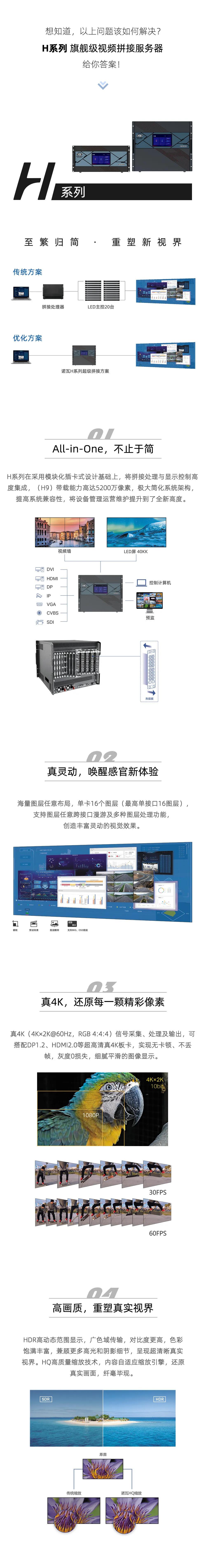 H 系列基于強大的硬件 FPGA 系統(tǒng)架構(gòu)和模塊化設(shè)計理念,不僅具有純硬件架構(gòu)穩(wěn)定高效的遺傳基因,同時可支持各種接口模塊進行靈活的個性化組合,維護簡單,降低設(shè)備故障率。H 系列支持市面常見的 HDMI、DVI、DP 和 IP 輸入接口,支持 10bit 視頻源輸入和處理,支持 4K 高清視頻輸入和輸出;支持 16 網(wǎng)口和 2 光口的 LED 拼接發(fā)送卡,實現(xiàn)光口、網(wǎng)口間備份和超遠(yuǎn)距離傳輸,支持多屏多圖層管理,輸入輸出 EDID 管理和預(yù)監(jiān),輸入源名稱修改,BKG 和(廣州升信信息科技有限公司-LED顯示屏事業(yè)部www.fulisat.cn)